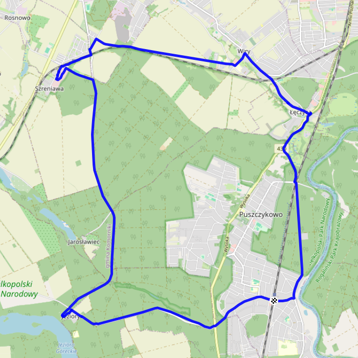 23.4 km circular route through Wielkopolski National Park. Start and finish at Puszczykówko station.