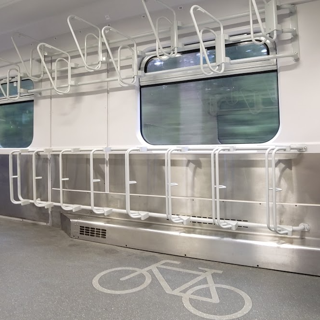 Efficient boarding can be a bit tricky, especially when the platform is crowded or when travelling with others. Always allow other passengers to disembark first. Then wait until “normal” passengers have boarded so that you do not inconvenience anyone. Get on and place your bicycle in the designated holder. On some trains, your bicycle is placed horizontally, while on others you have to hang it by the front wheel – not always easy to do, especially if your bicycle is heavy, has panniers, or if you simply don’t have the strength. In such cases, don’t hesitate to ask someone for help.